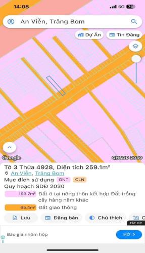 Bán đất thổ cư xã An Viễn huyện Trảng Bom diện tích 259 mét vuông giá