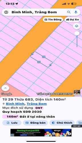 BÁN LÔ ĐẤT KHU TÁI ĐỊNH CƯ XÃ BÌNH MINH.TRẢNG BOM DT 140M GIÁ 2,22 TỶ